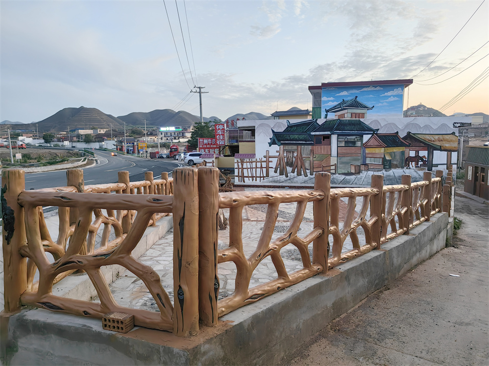 記者看到,整治后,水阜鎮在原地圈出綠化帶,在外圍建起長達1500米的仿木圍欄,又在相接的房屋外立面進行彩繪。值得一提的是,彩繪將古水阜作為驛站的場景生動再現,不僅繪制建筑群,還繪有馬飲水等的畫面。