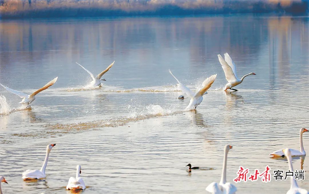 大天鵝在西固區(qū)達川鎮(zhèn)黃河水域嬉戲。新甘肅·甘肅日報記者 丁凱