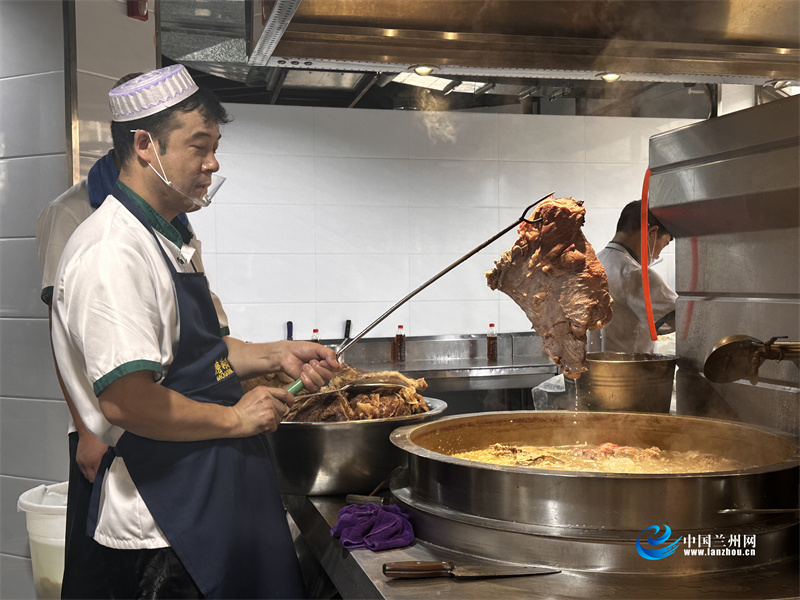 磨溝沿牛肉面的第一家門店——七里河區文化宮店開設于1999年,從最初的20平方米的平房起步,發展到擁有10家直營店、總面積達到2500平方米的經營規模,最“年輕”的隴能家園店于2021年開業,每天出面量達到1800碗以上,賣出300—500斤的生牛肉。磨溝沿牛肉面以優質牛肉、有機面條搭配骨湯、特色輔料而聞名,面粉選擇塞北雪品牌,牛肉每天從張掖武威正規大型養殖場采購,經過嚴格的工序煮出來的牛肉軟爛,深受食客喜愛。“我們的面比較勁道,湯比較濃,辣椒香而不辣。滿足本地食客的同時,也符合外地食客口味。這個假期,我們店外地游客能達到一半。”磨溝沿牛肉面隴能家園負責人馬福斌說。